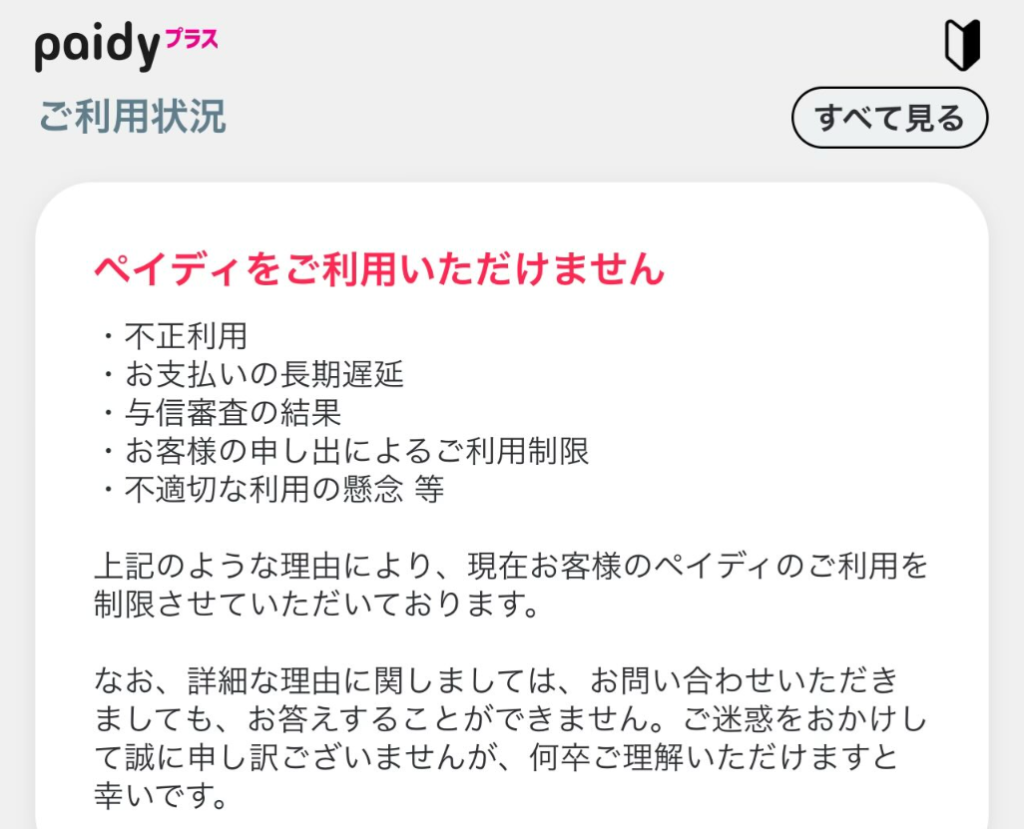 ペイディ側では利用停止の理由を利用者に開示しないため、身に覚えがない場合は戸惑ってしまう事でしょう。